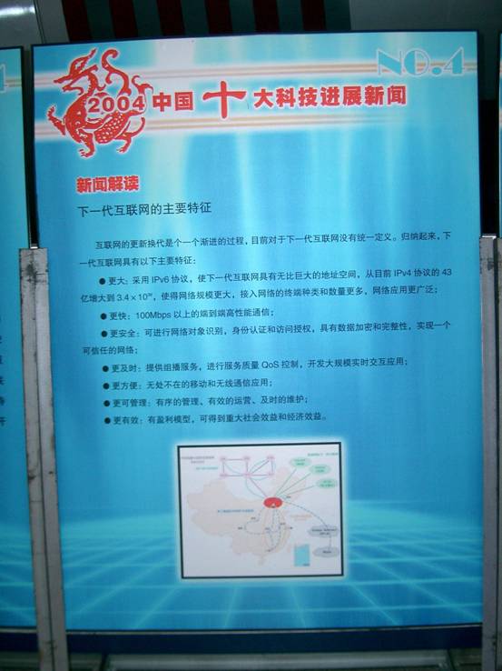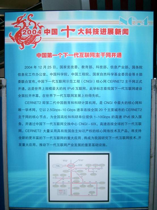 日前,“2004年中國、世界十大科技進展新聞”科普展覽在北京中國科技館開幕。展覽由科學報時社、中國科學院院士工作局、中國工程院學部工作局和中國科學技術館聯合舉辦,將在全國各地科技館巡回展出。此次展覽的主要內容是“振邦杯2004年中國十大科技進展新聞和世界十大科技進展新聞”,由584名中國科學院院士和中國工程院院士投票選出。作為2004年科技發展重大事件之一,以中國下一代互聯網示范工程CNGI核心網CERNET2也參加了此次全國巡展,并將以圖文并茂、專家點評、新聞鏈接等形式,全方位、立體化展現給社會公眾。